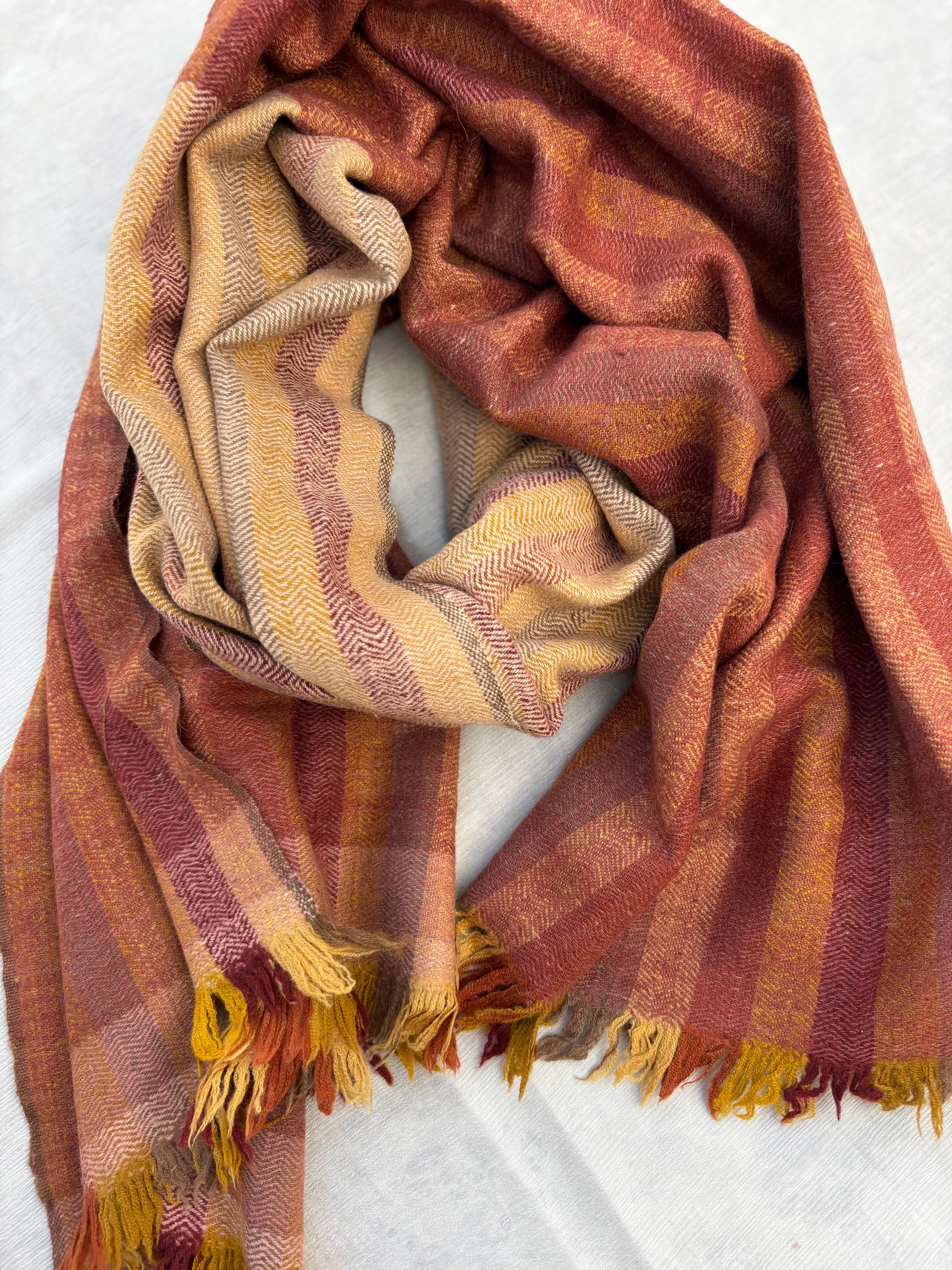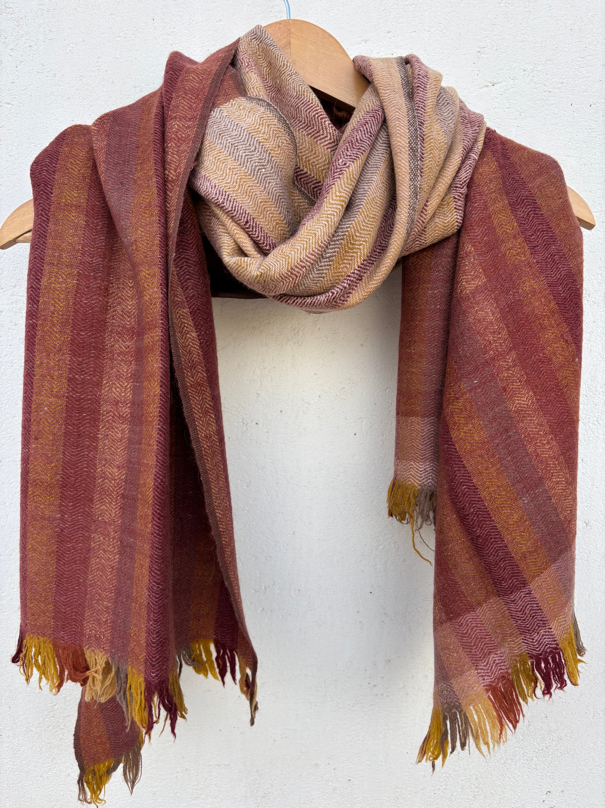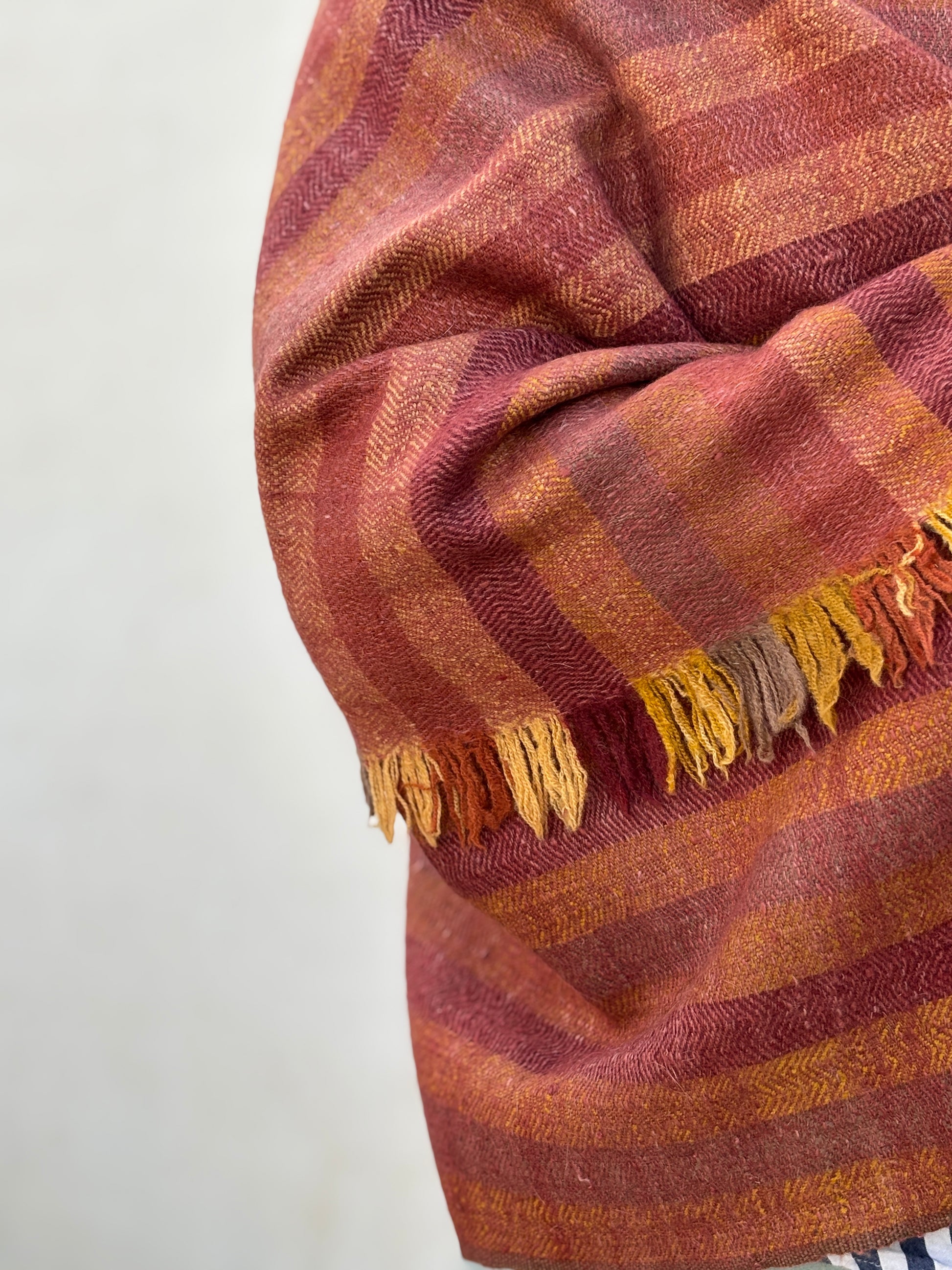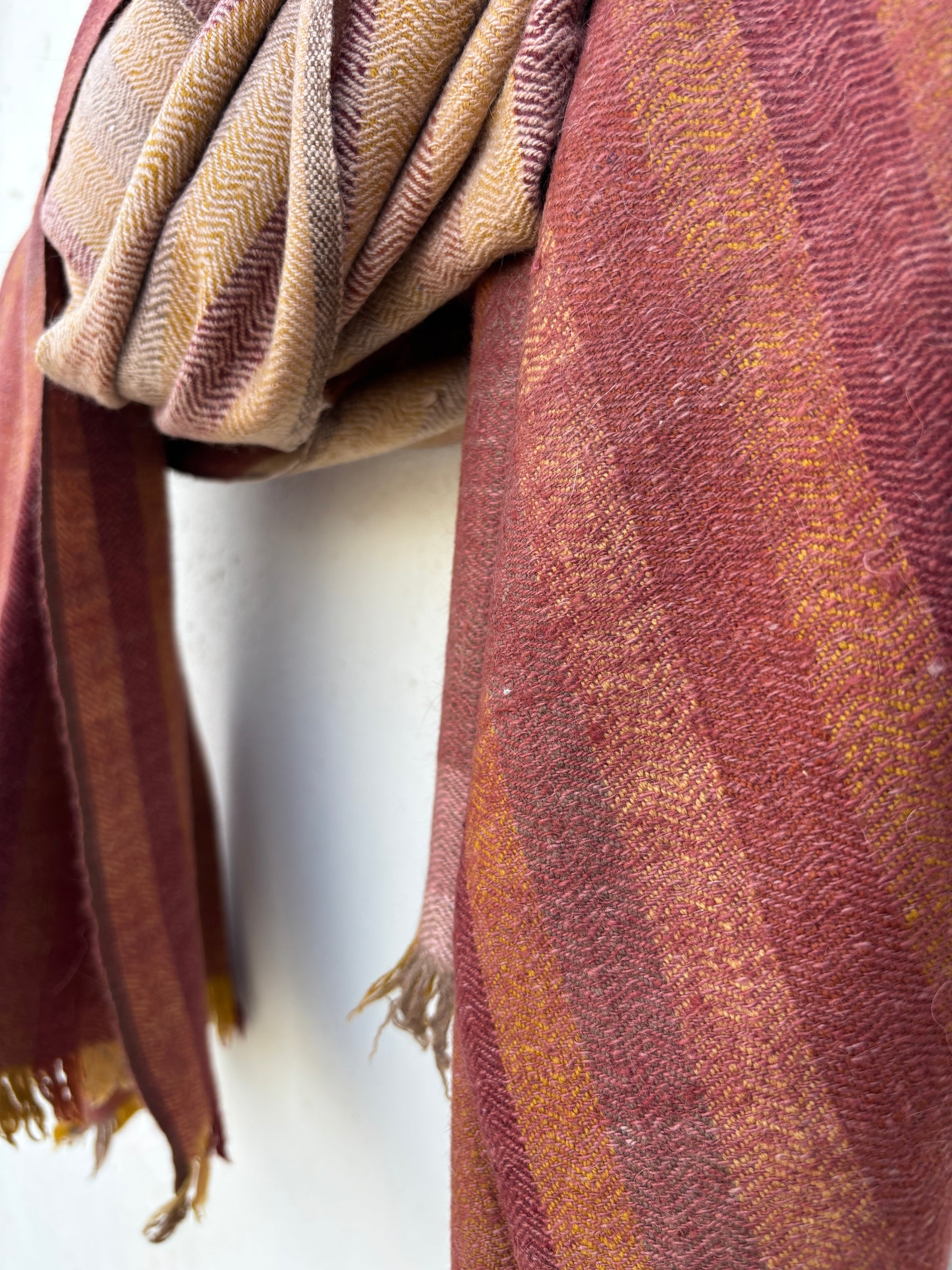 a luxuriously soft pashmina wrap woven in deep pink-red tones, accented with touches of other graceful hues for a vibrant yet elegant finish