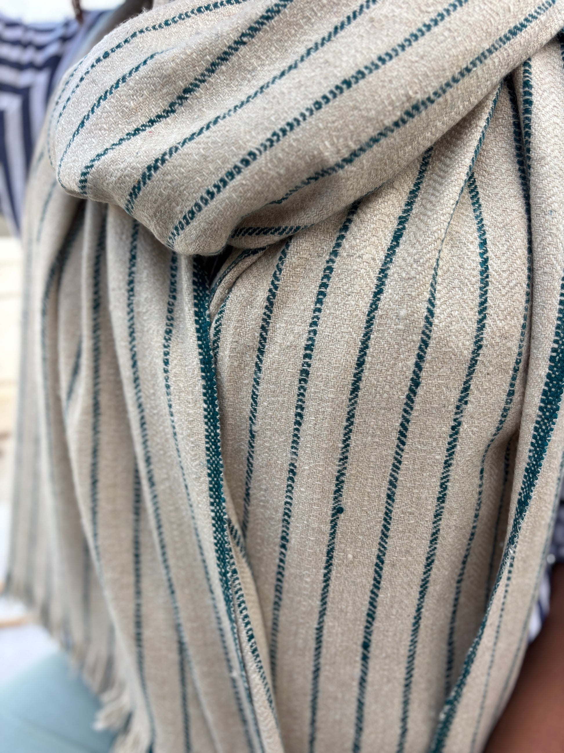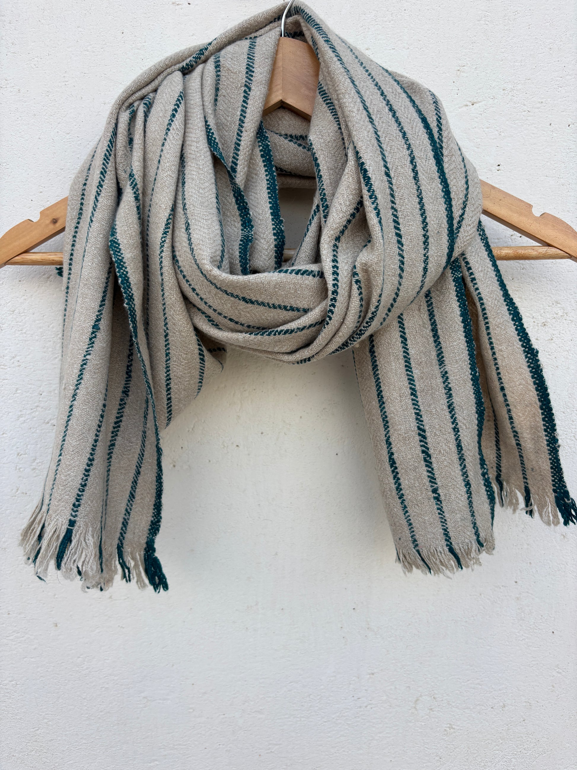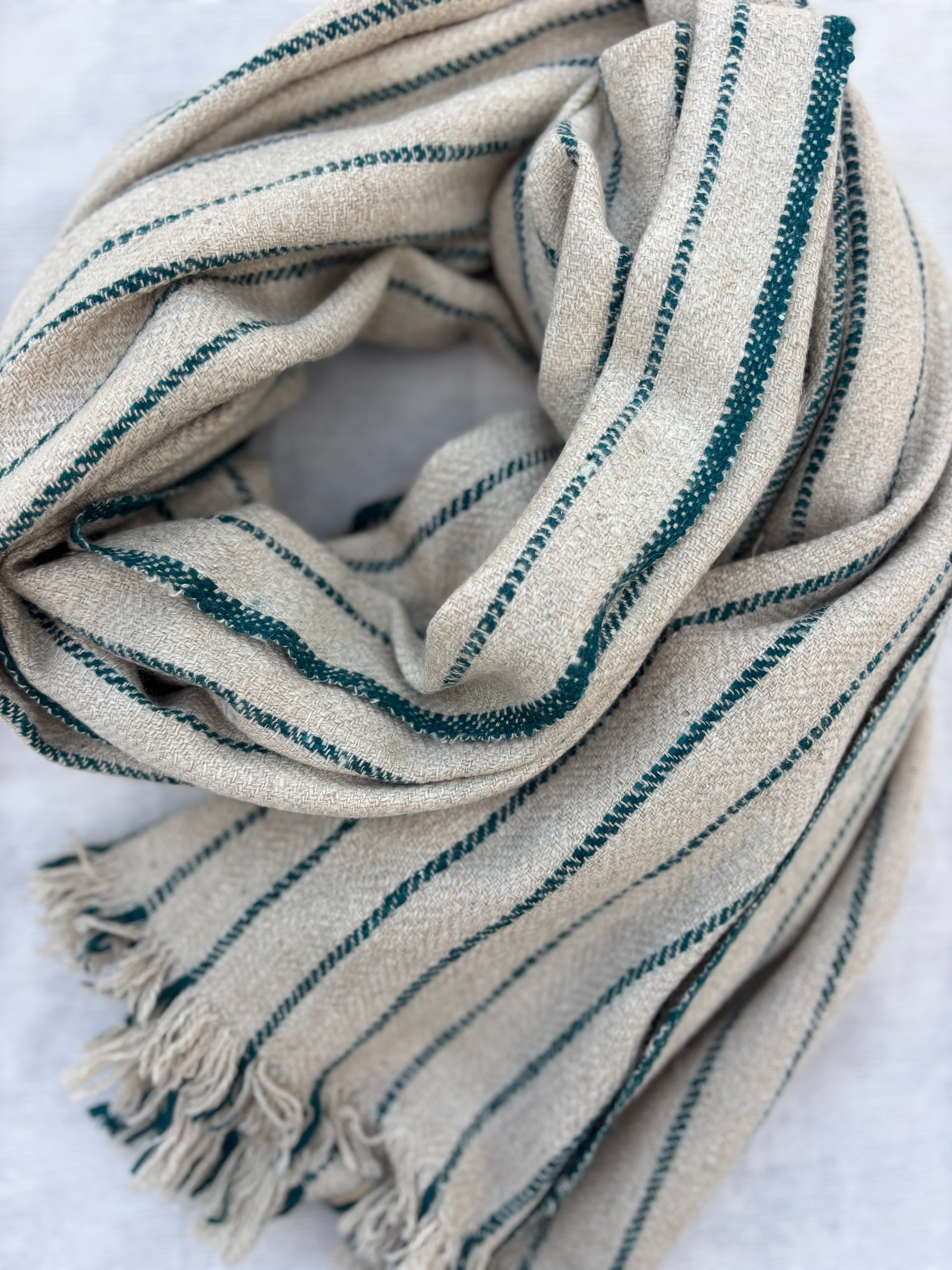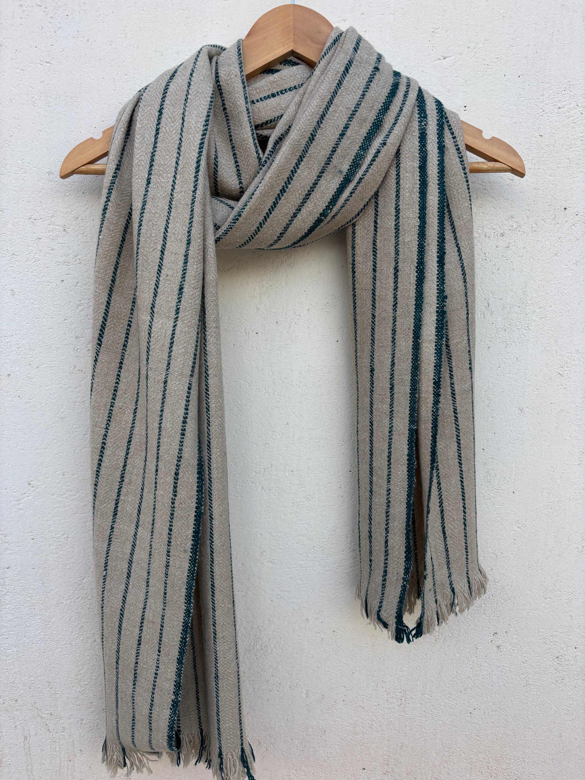 A handwoven Pashmina wrap in natural beige and teal stripes, finished with soft tassels for a timeless, elegant drape