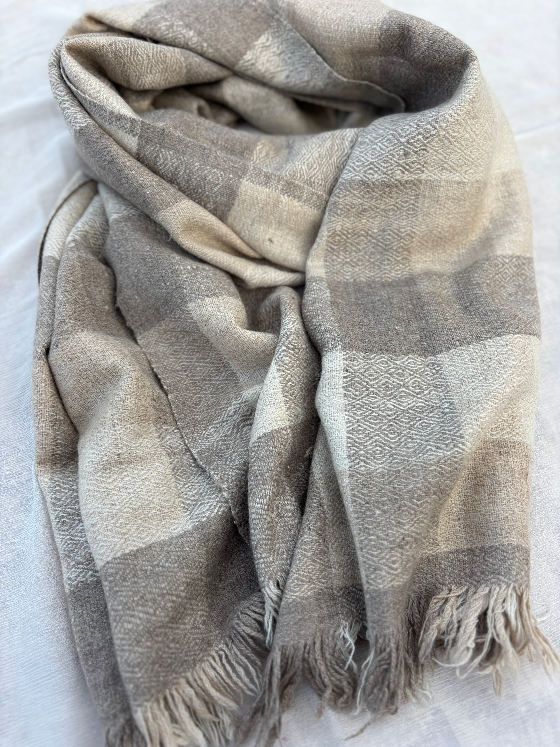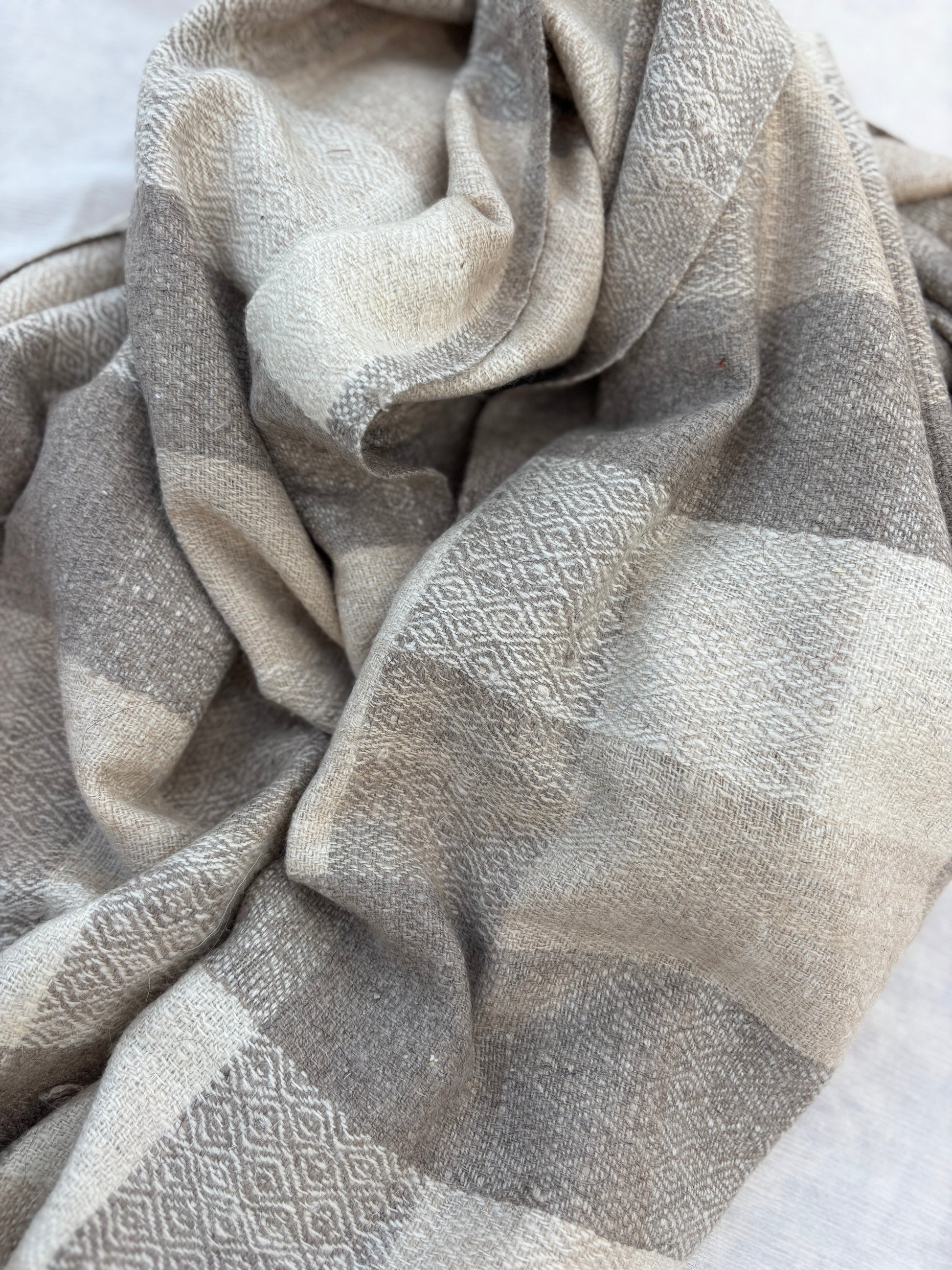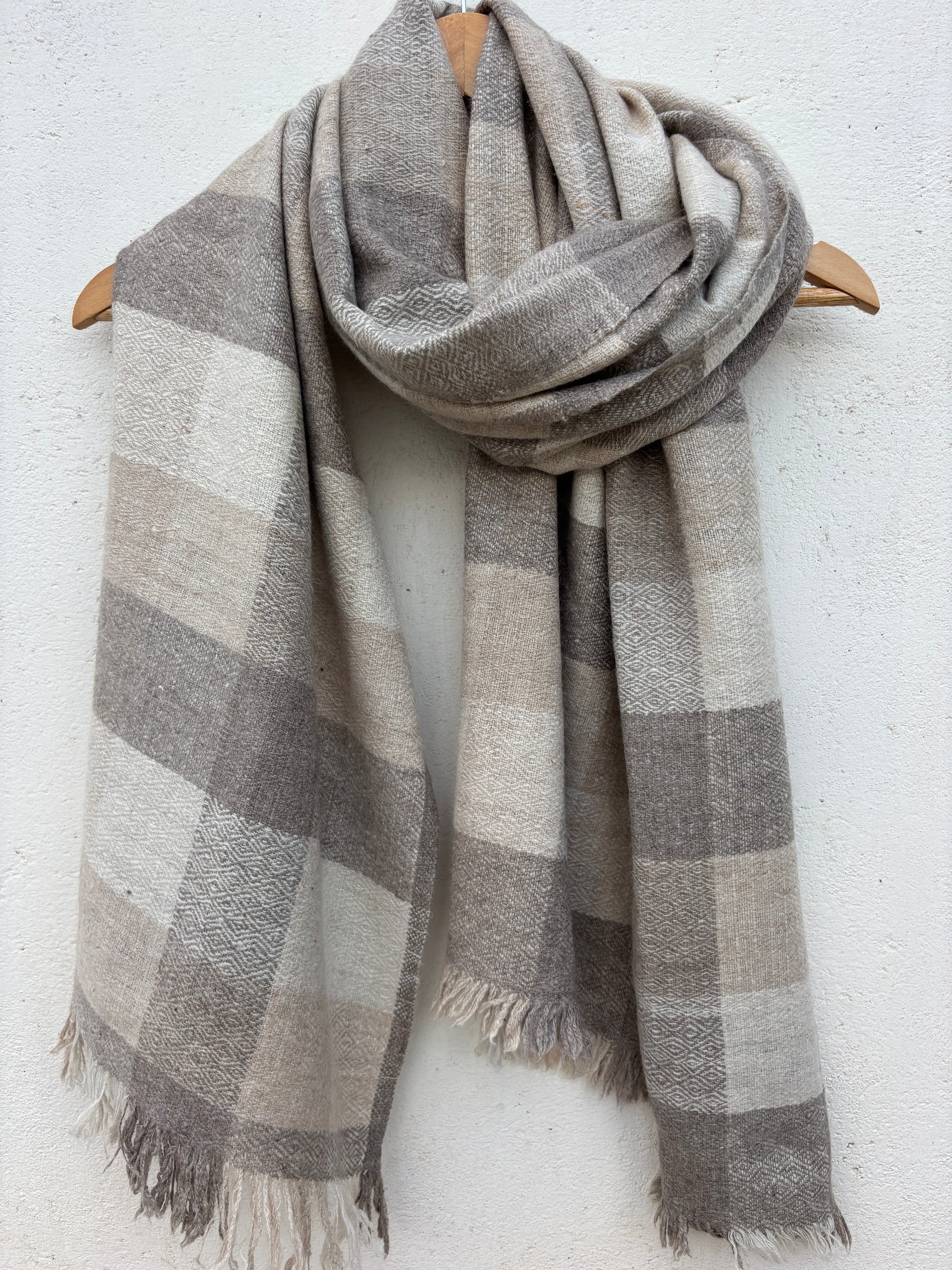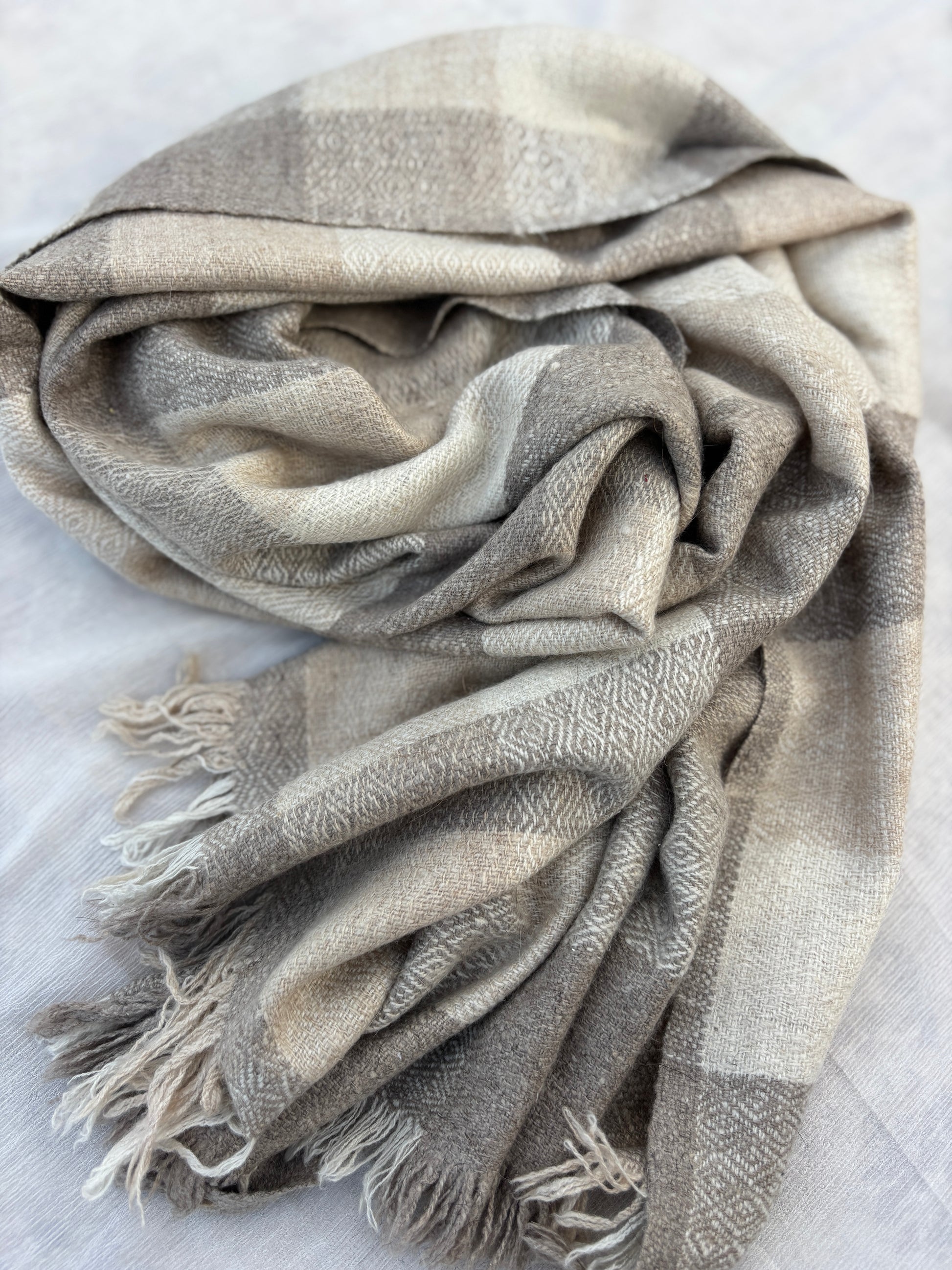 A soft plaid Pashmina wrap woven in calming tones of beige, grey, and white, perfect for a neutral, timeless look