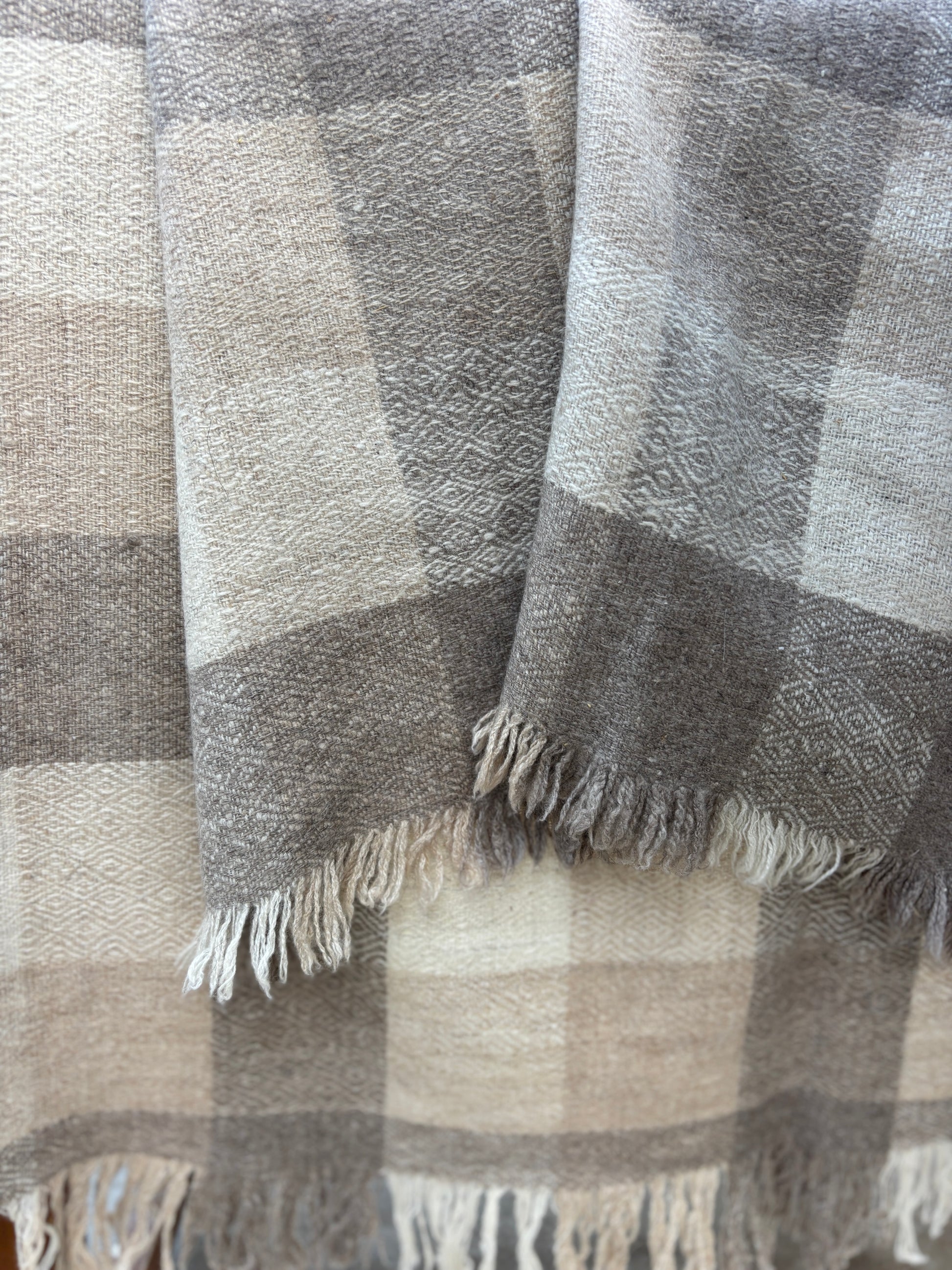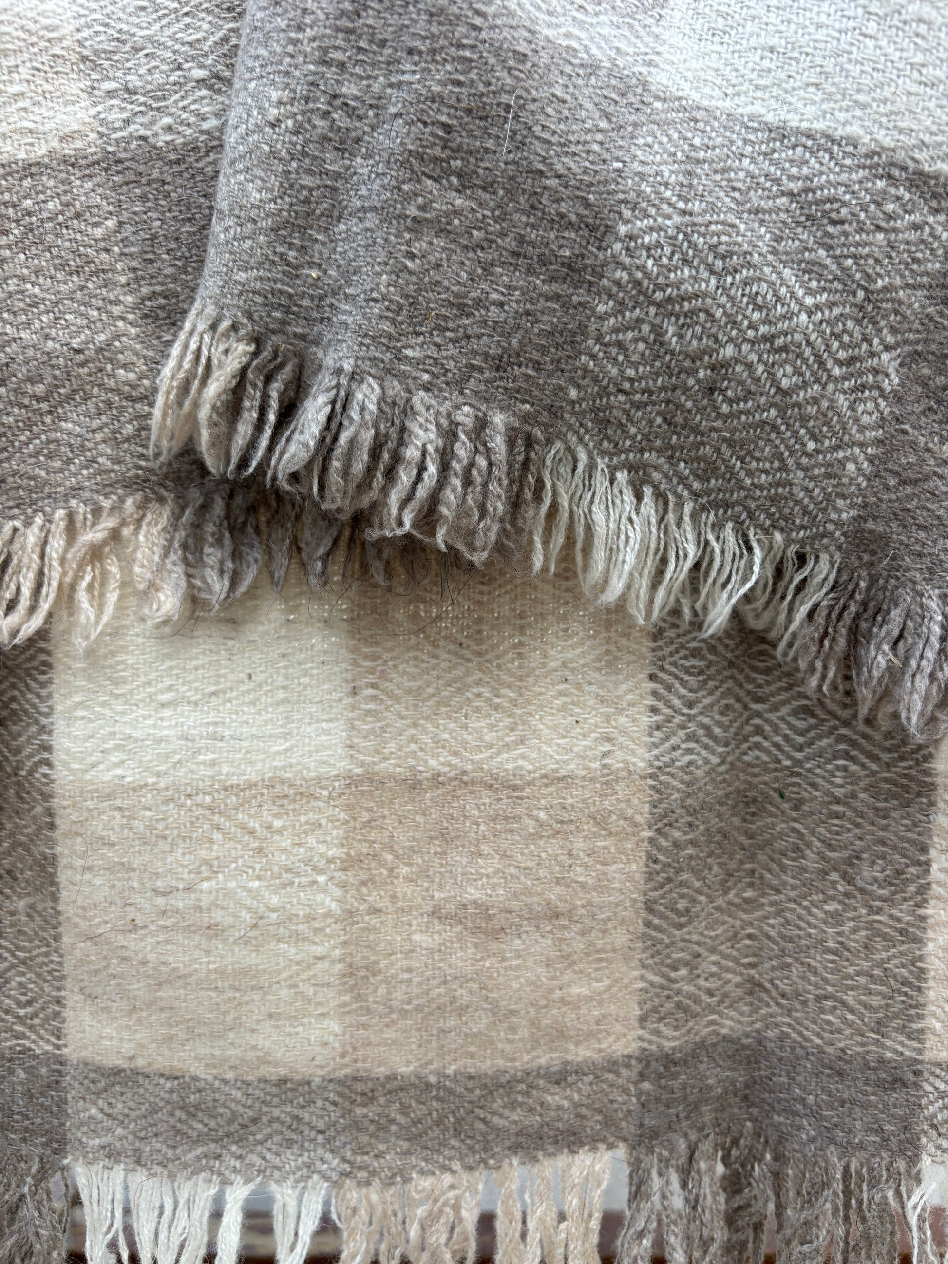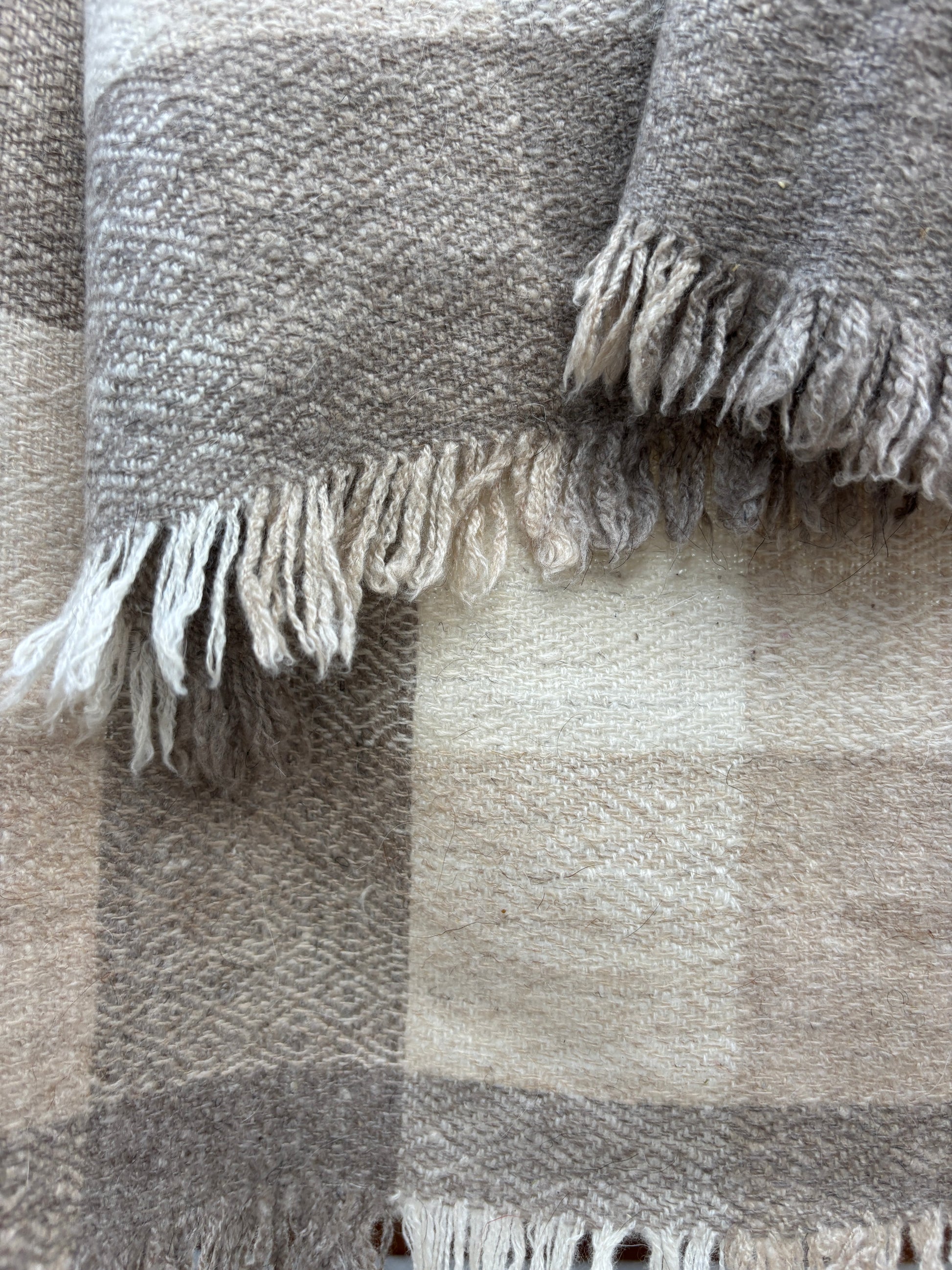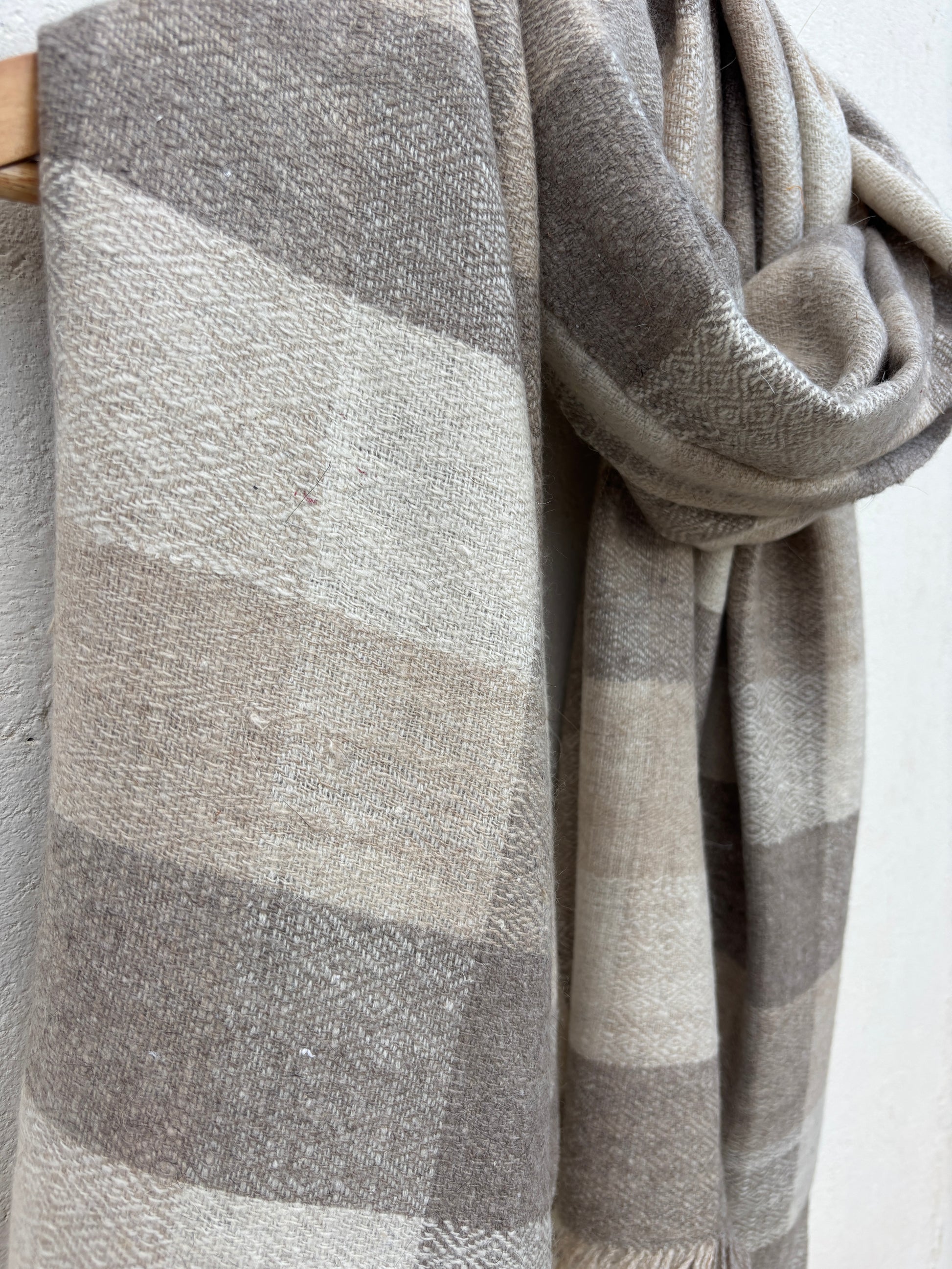 A soft plaid Pashmina wrap woven in calming tones of beige, grey, and white, perfect for a neutral, timeless look