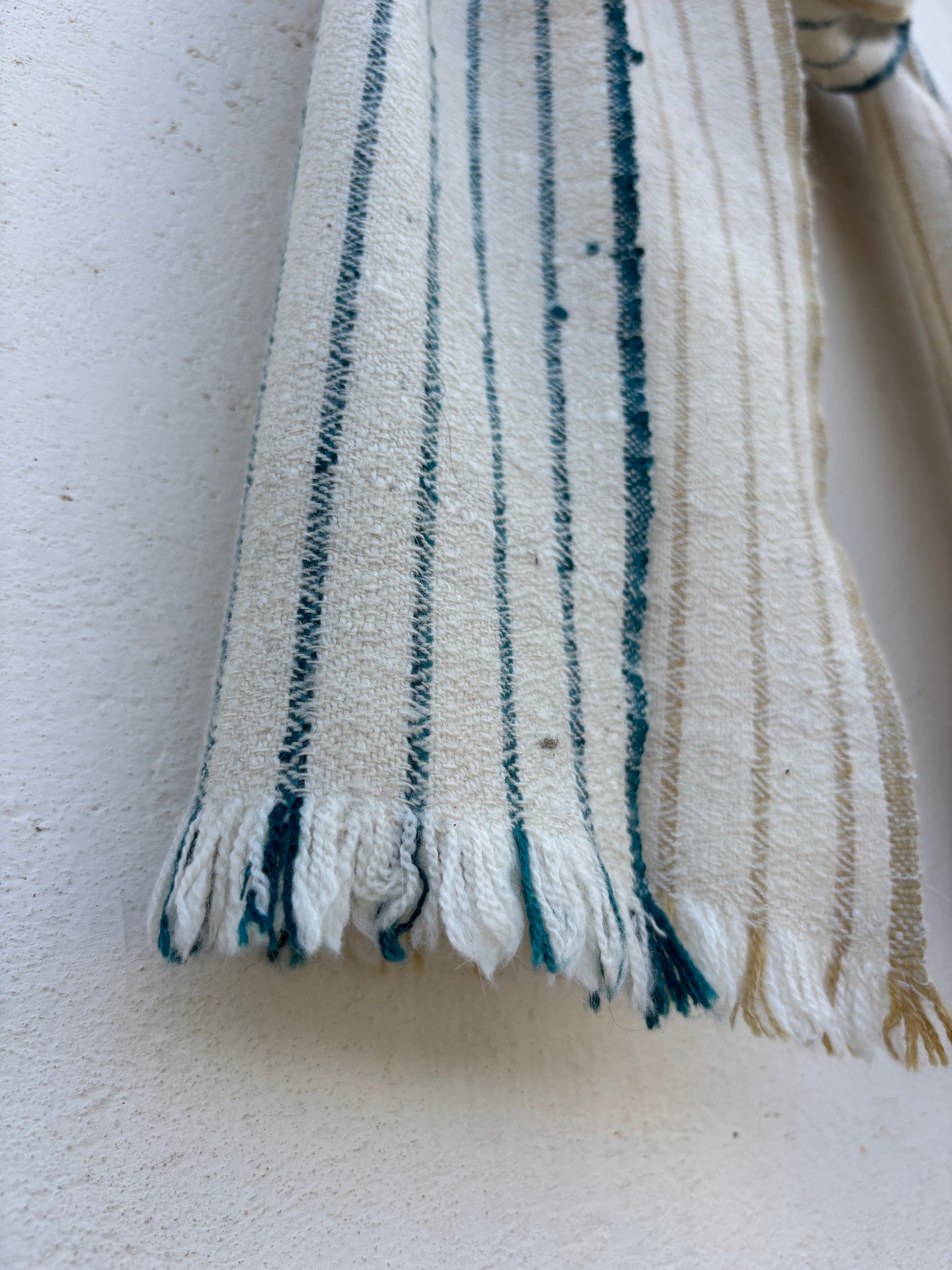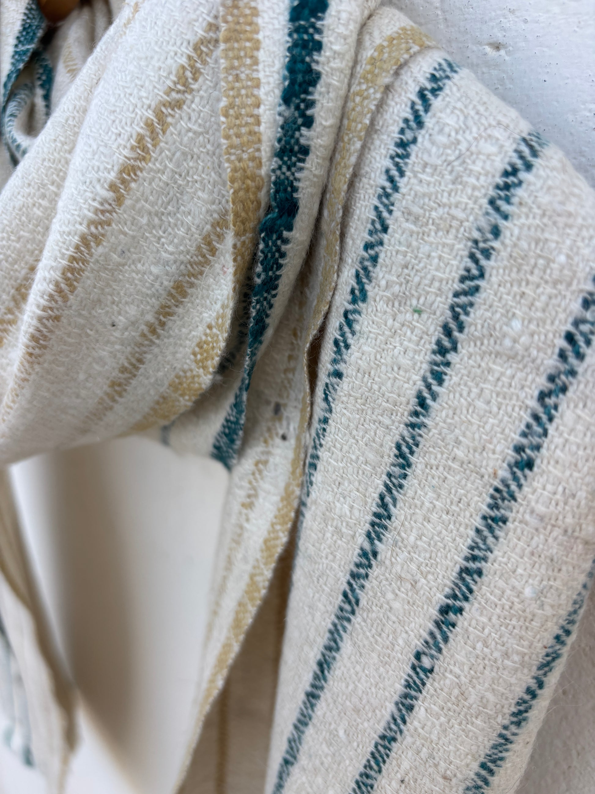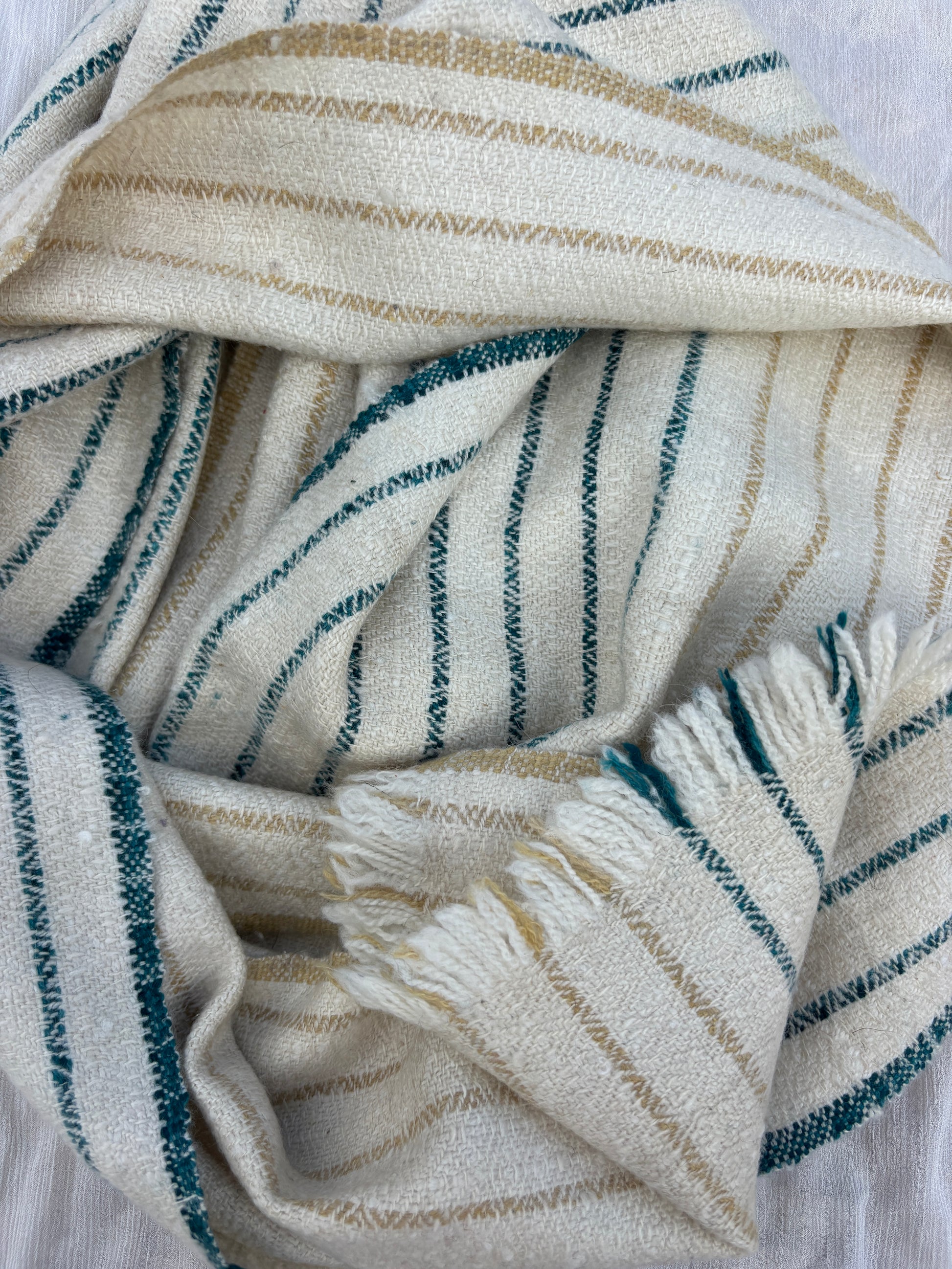 A handwoven Pashmina wrap with elegant dark green and beige stripes, blending richness with subtle warmth