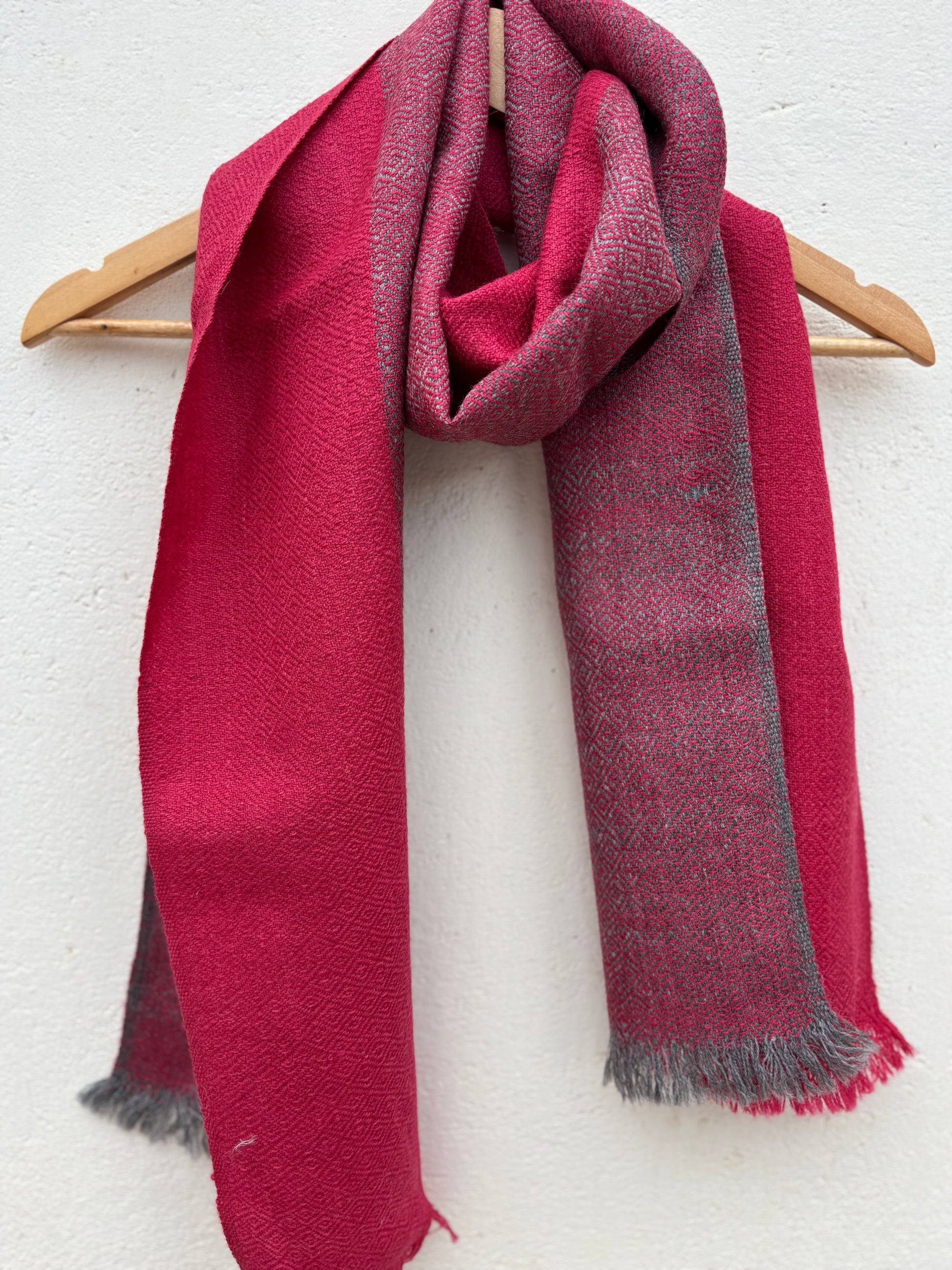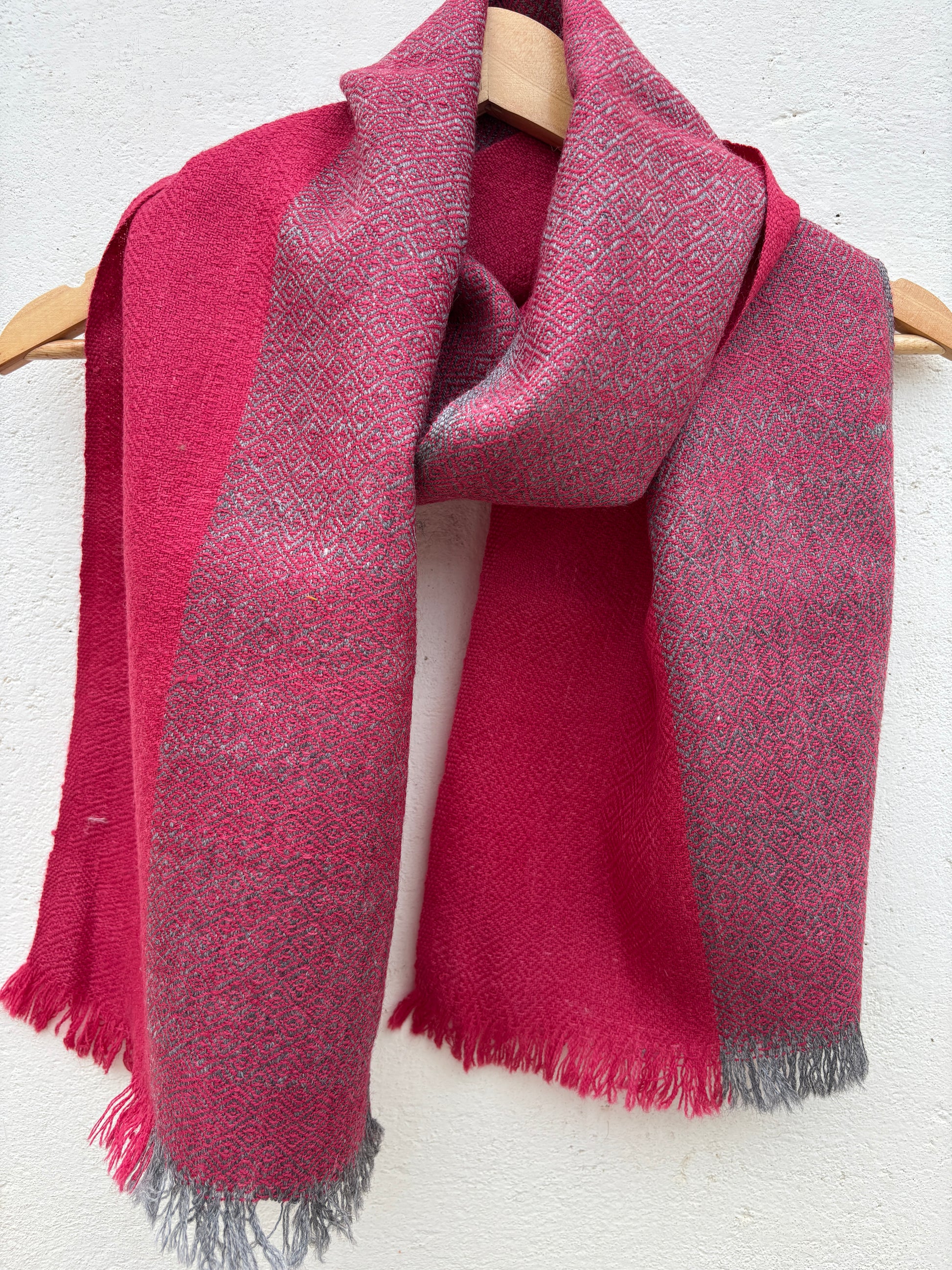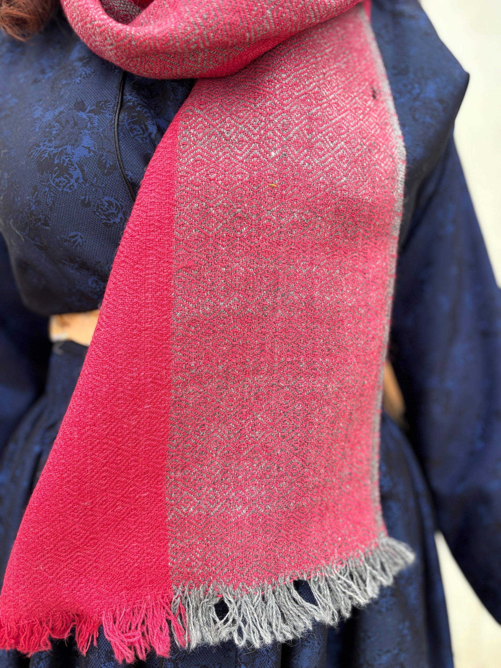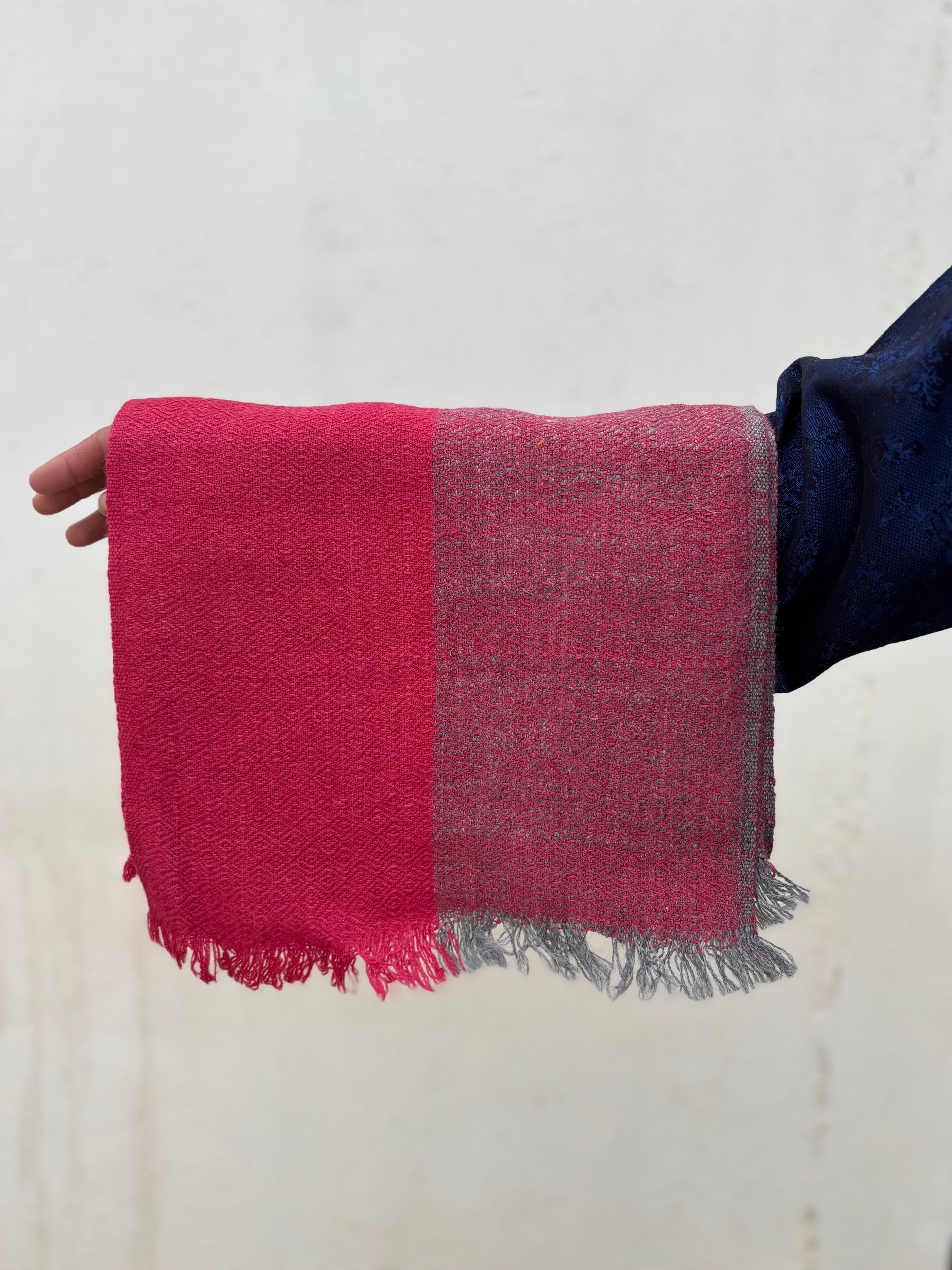 A beautiful blend of pink and grey tones. Stay warm and stylish with this luxurious accessory that adds a touch of elegance to any outfit.