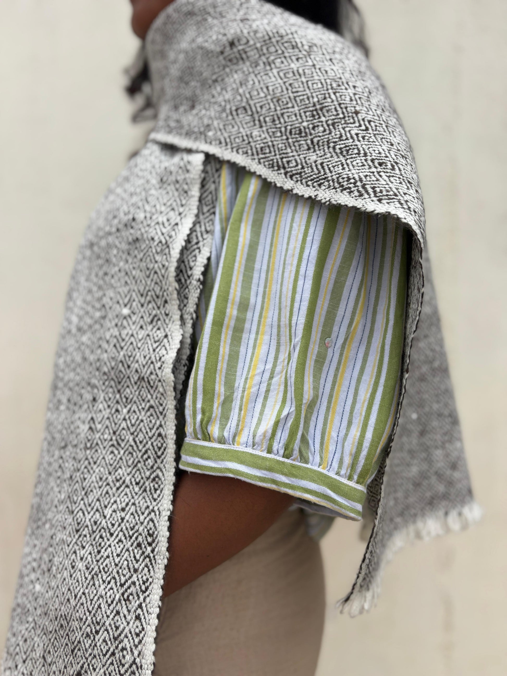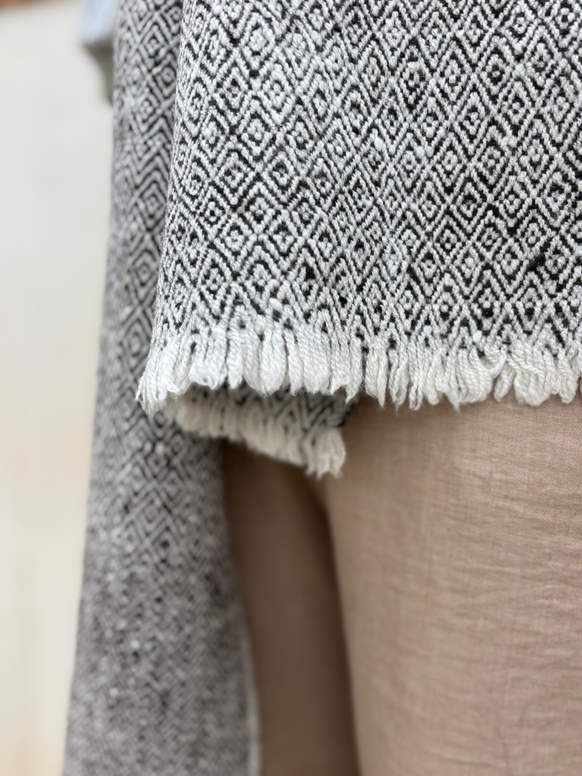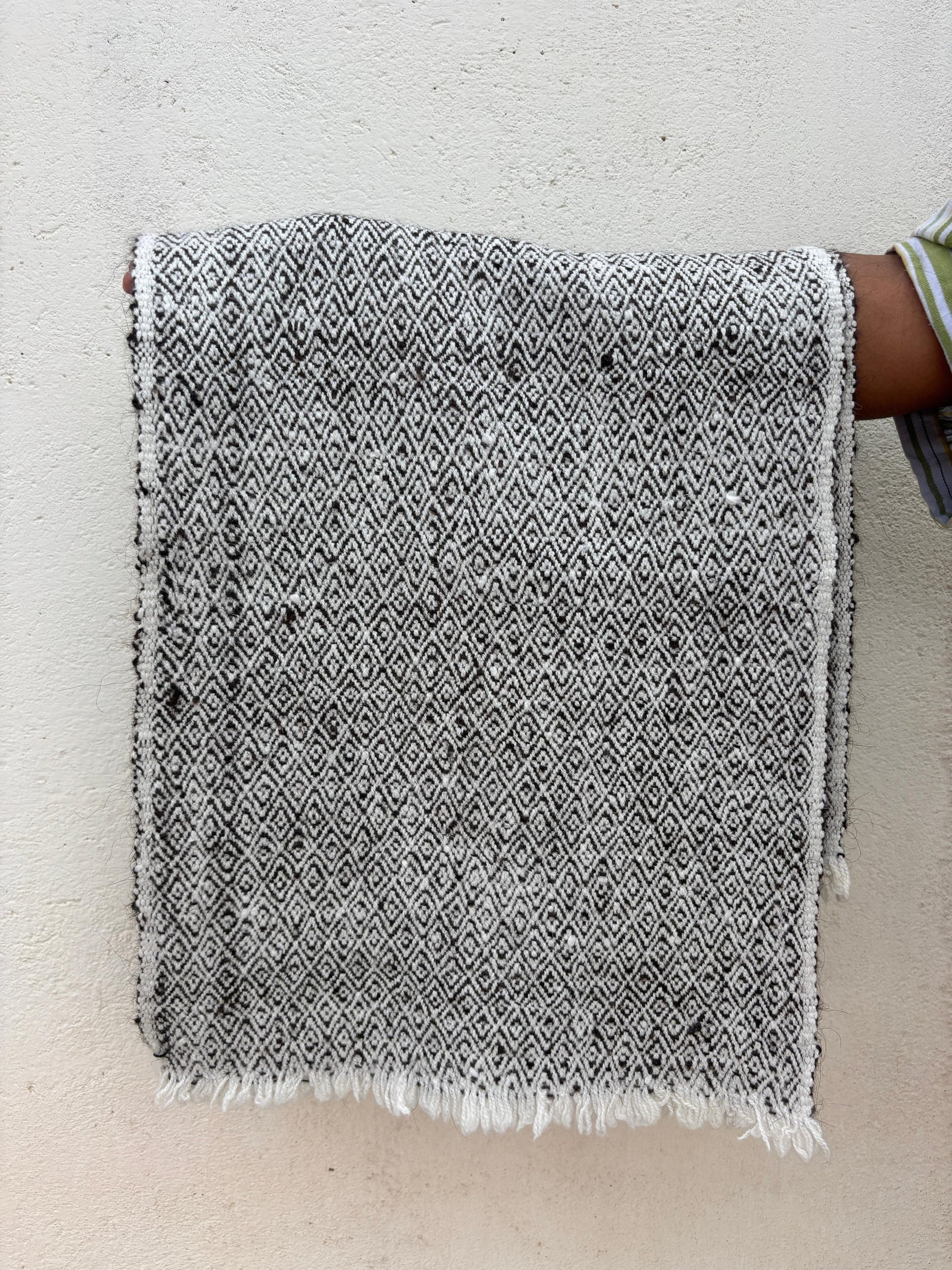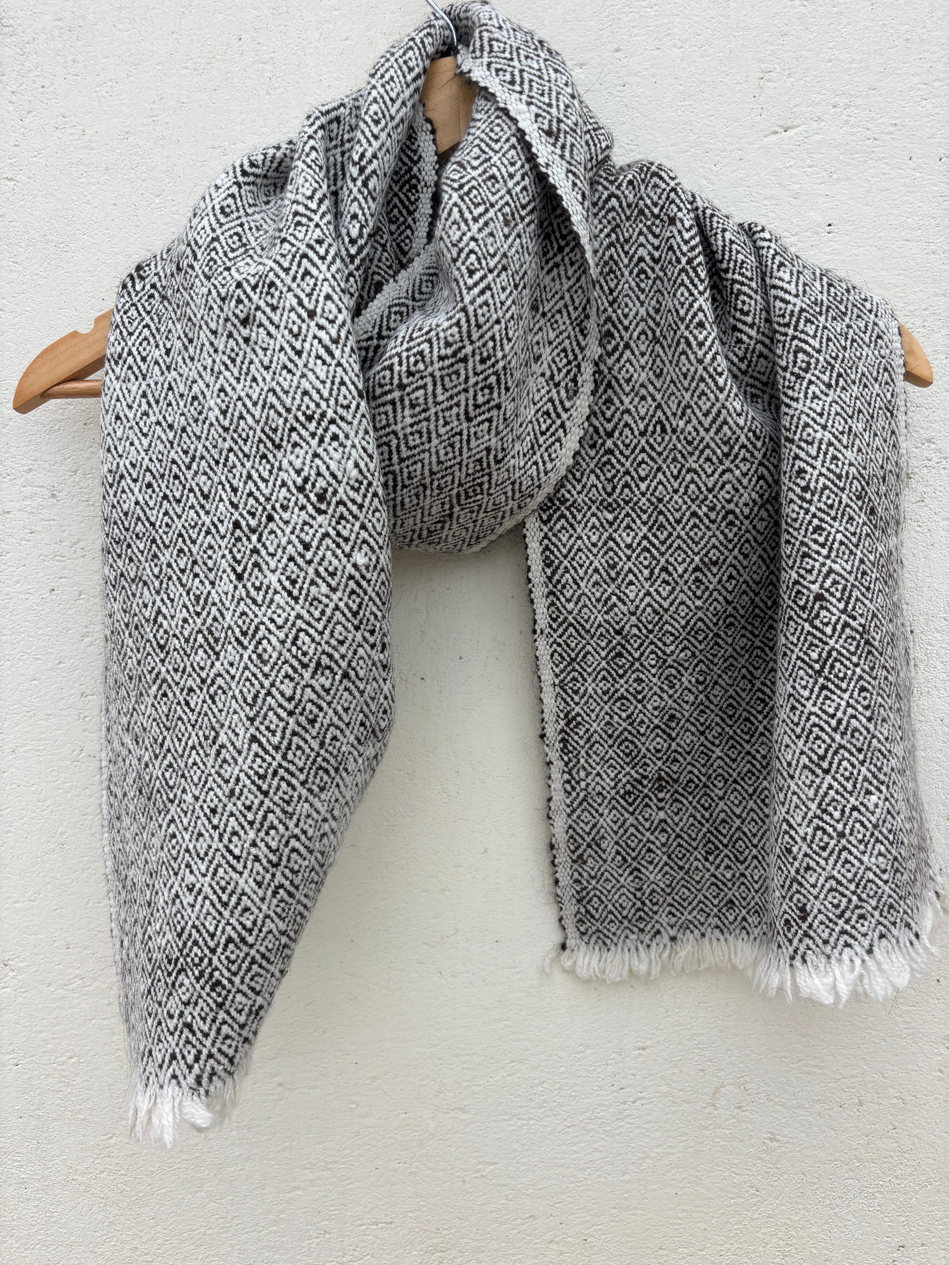 A soft, handwoven yak wool wrap blending natural black and white tones for a timeless, earthy look