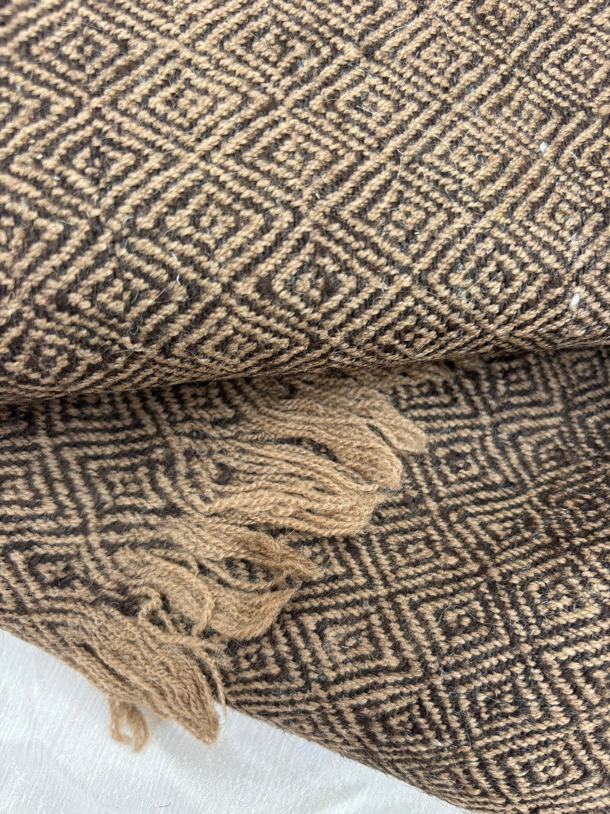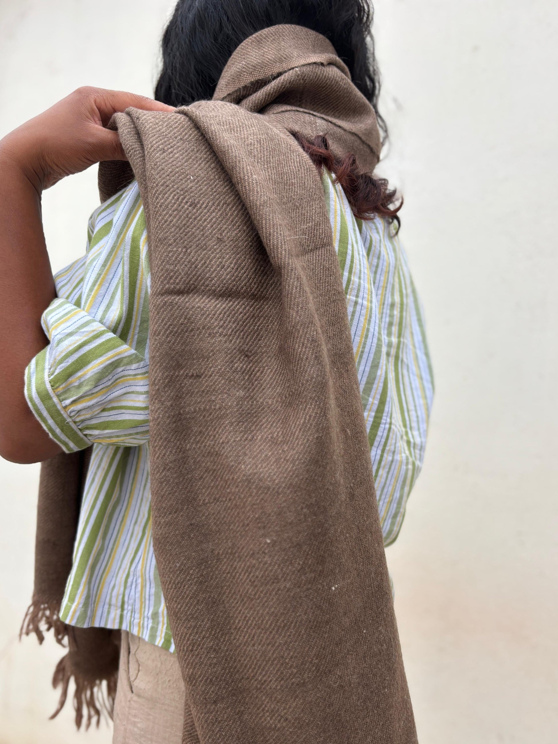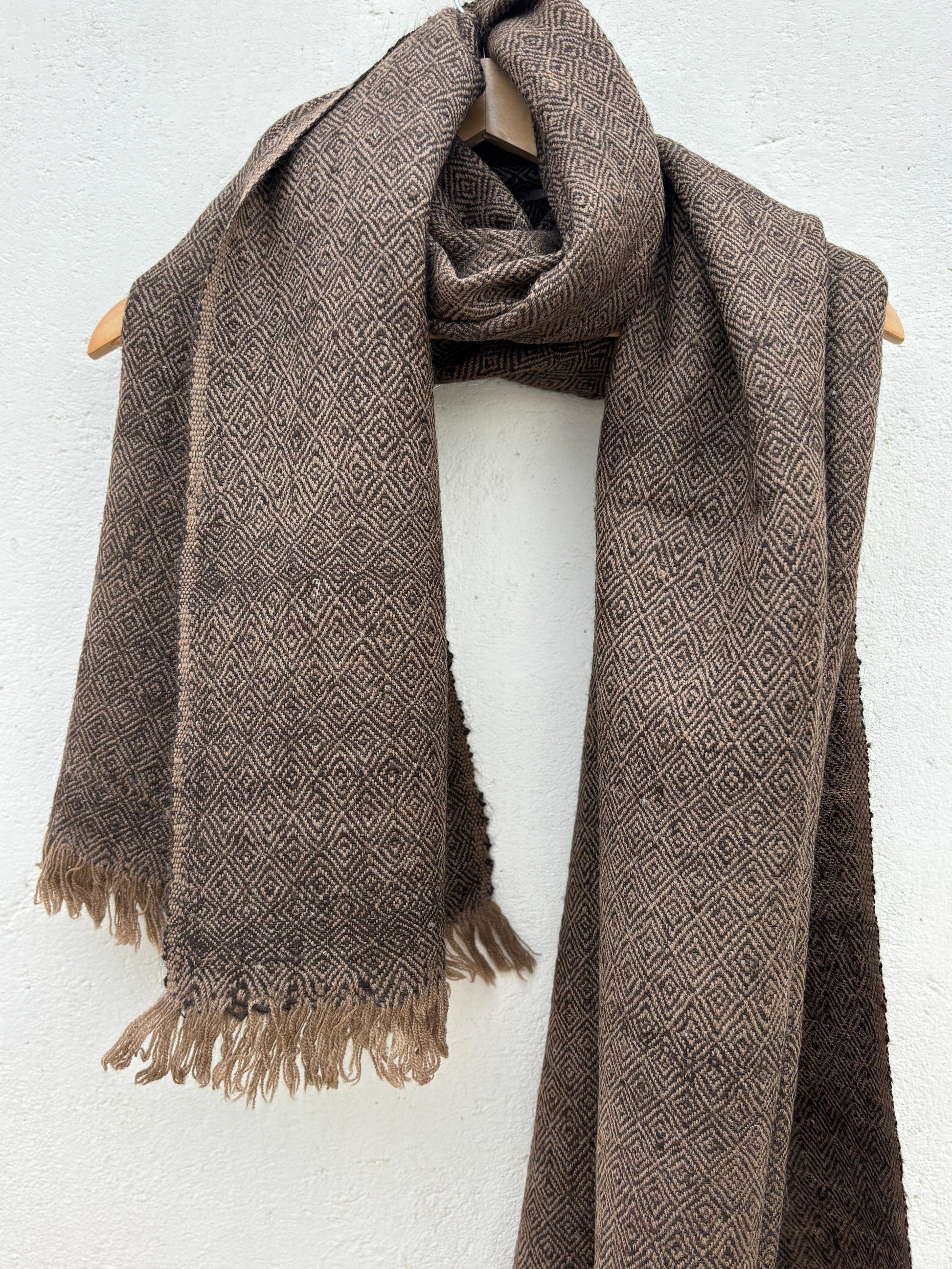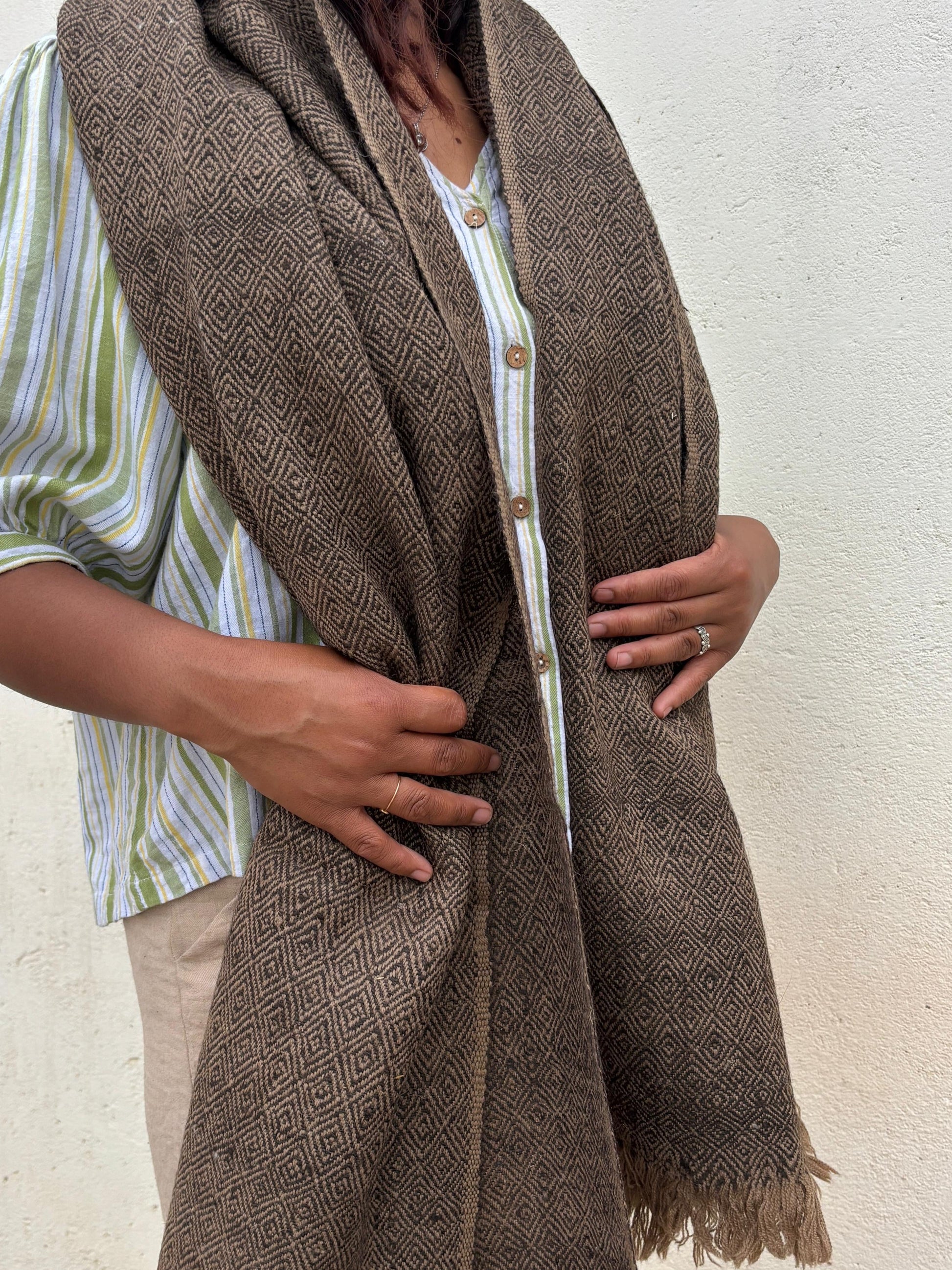 A handwoven yak wool wrap in warm brown, accented with delicate black patterns for a subtle, earthy charm