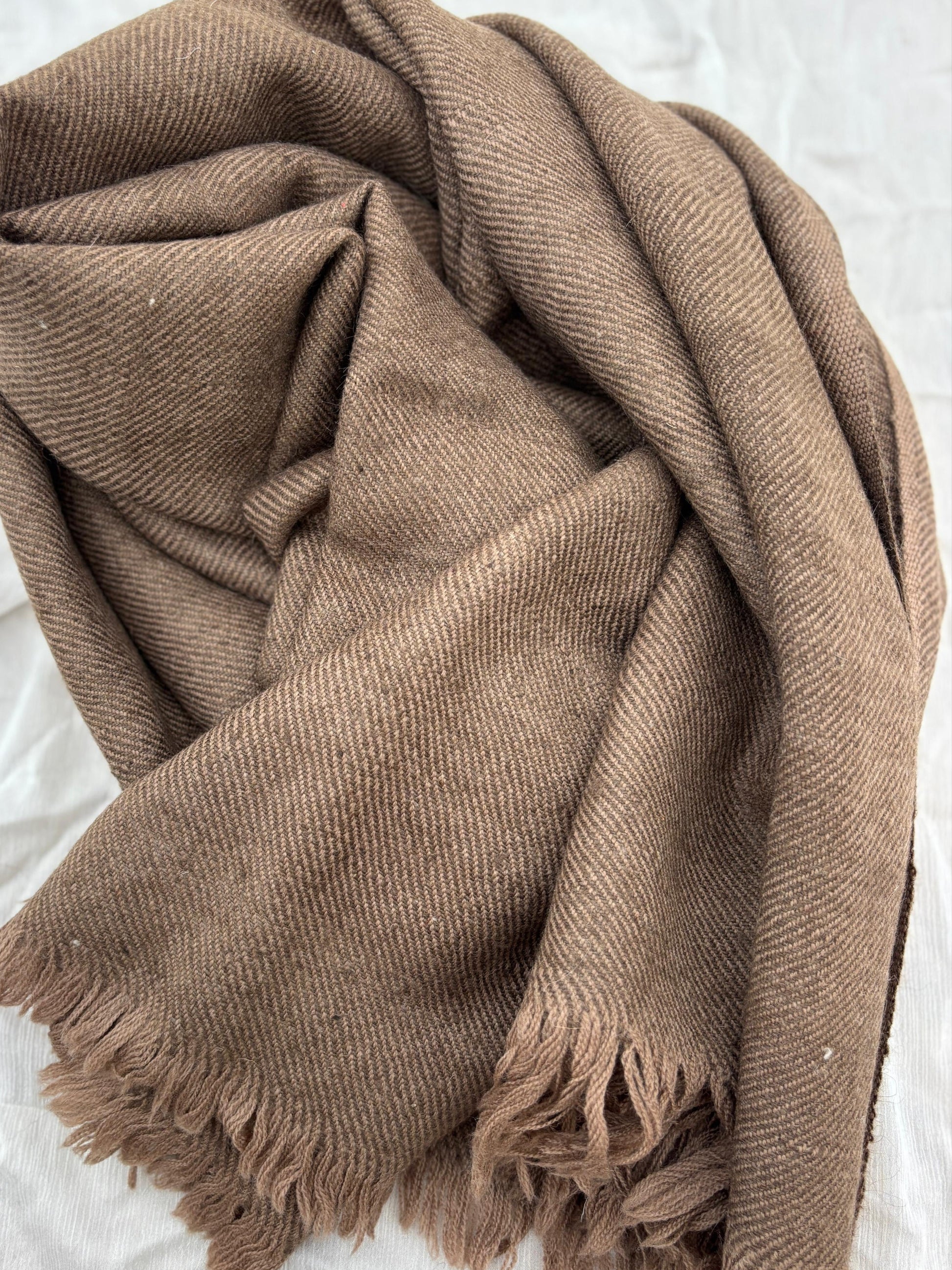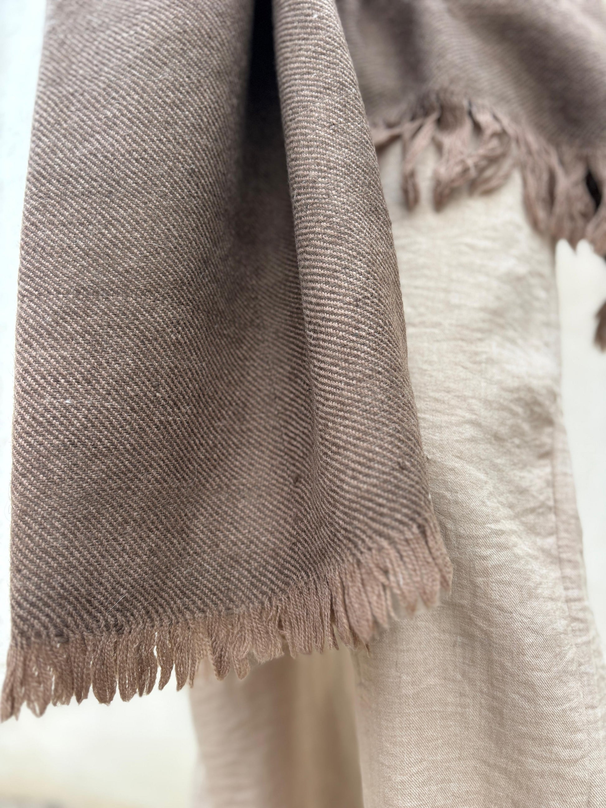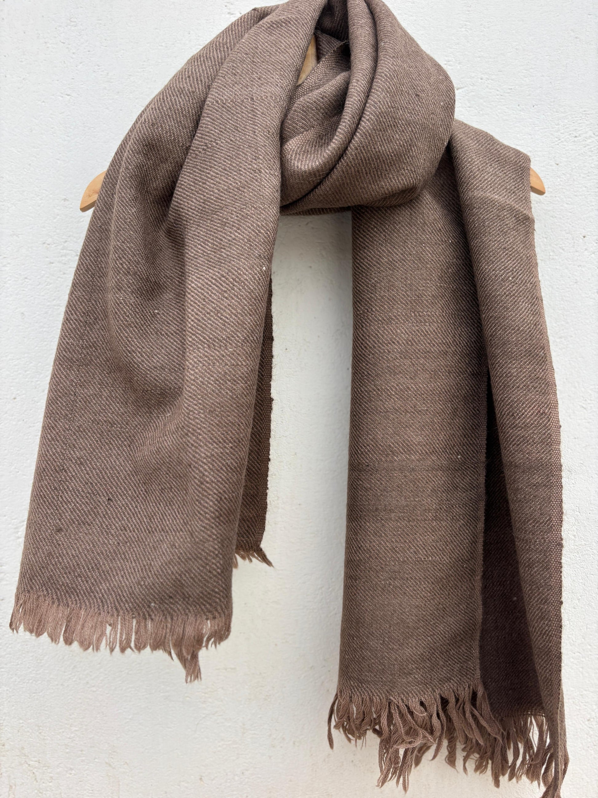 A handwoven yak wool wrap in soft light brown, offering natural warmth with a gentle, timeless tone